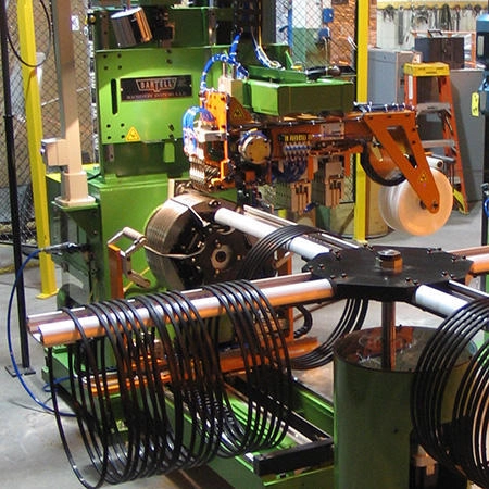 Automatic Bead Handling Systems are available for integrating into either new bead lines or existing bead lines with designs for both weftless (ribbon) or single wire bead systems. Each system can be tailored to suit existing bead room layouts and can deliver beads directly to the next process. A Bartell designed bead handling system can help streamline your bead room production. By removing beads from the winder, handling, and automatically transferring to the next stage in your process, bead handling can improve your efficiency by integrating your bead room processes.